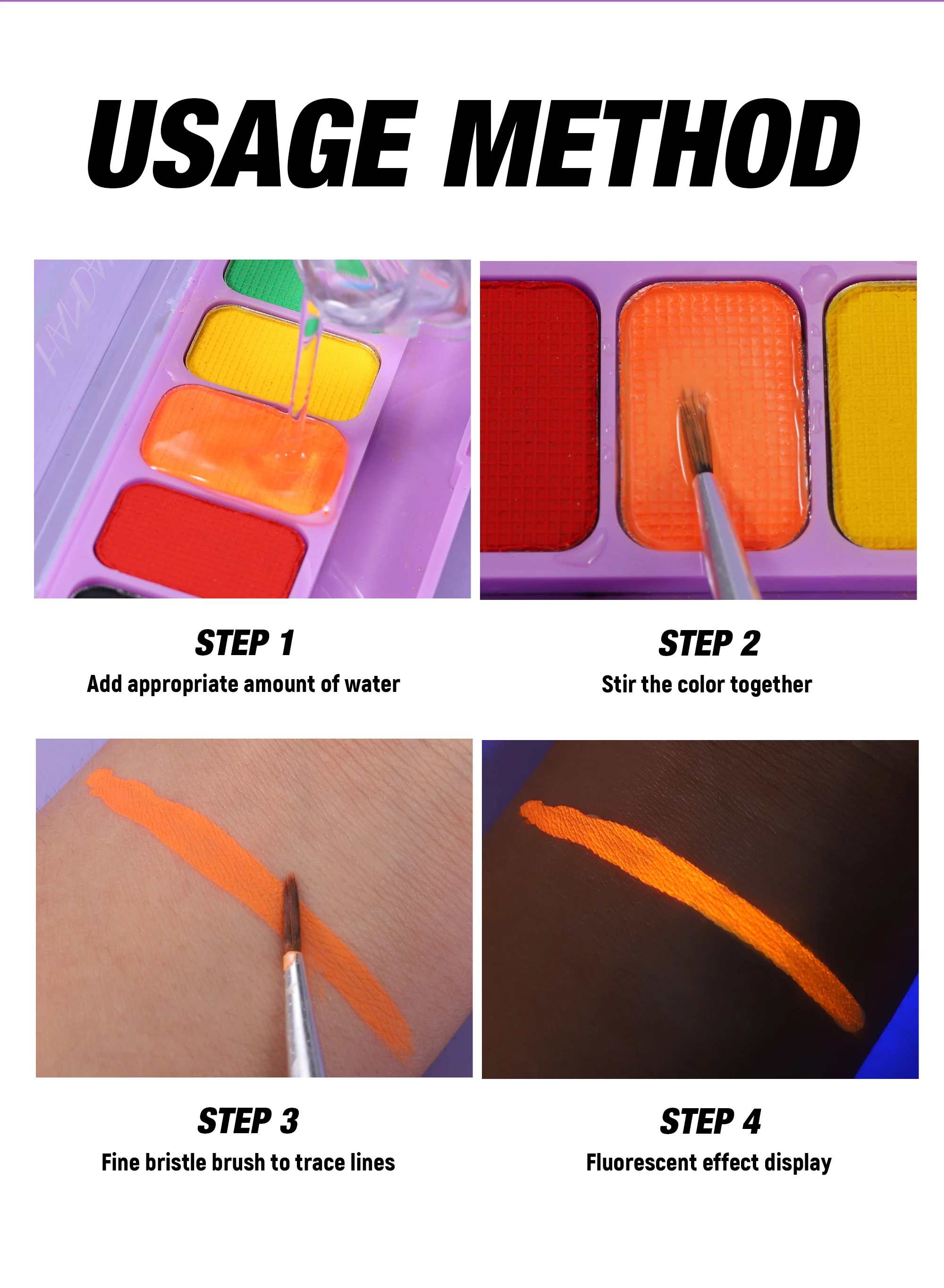 1. This fluorescent painting is certified non-toxic and free of harmful chemicals. It is safe to apply on the skin
