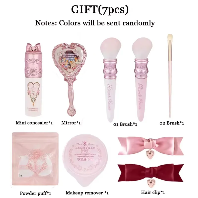 Free Gift: 7pcs, Colors will be sent randomly (Hair clip*1/01 Brush*1/02 Brush*1/Powder puff*1/Mirror*1/Mini concealer*1/Makeup remover *1)